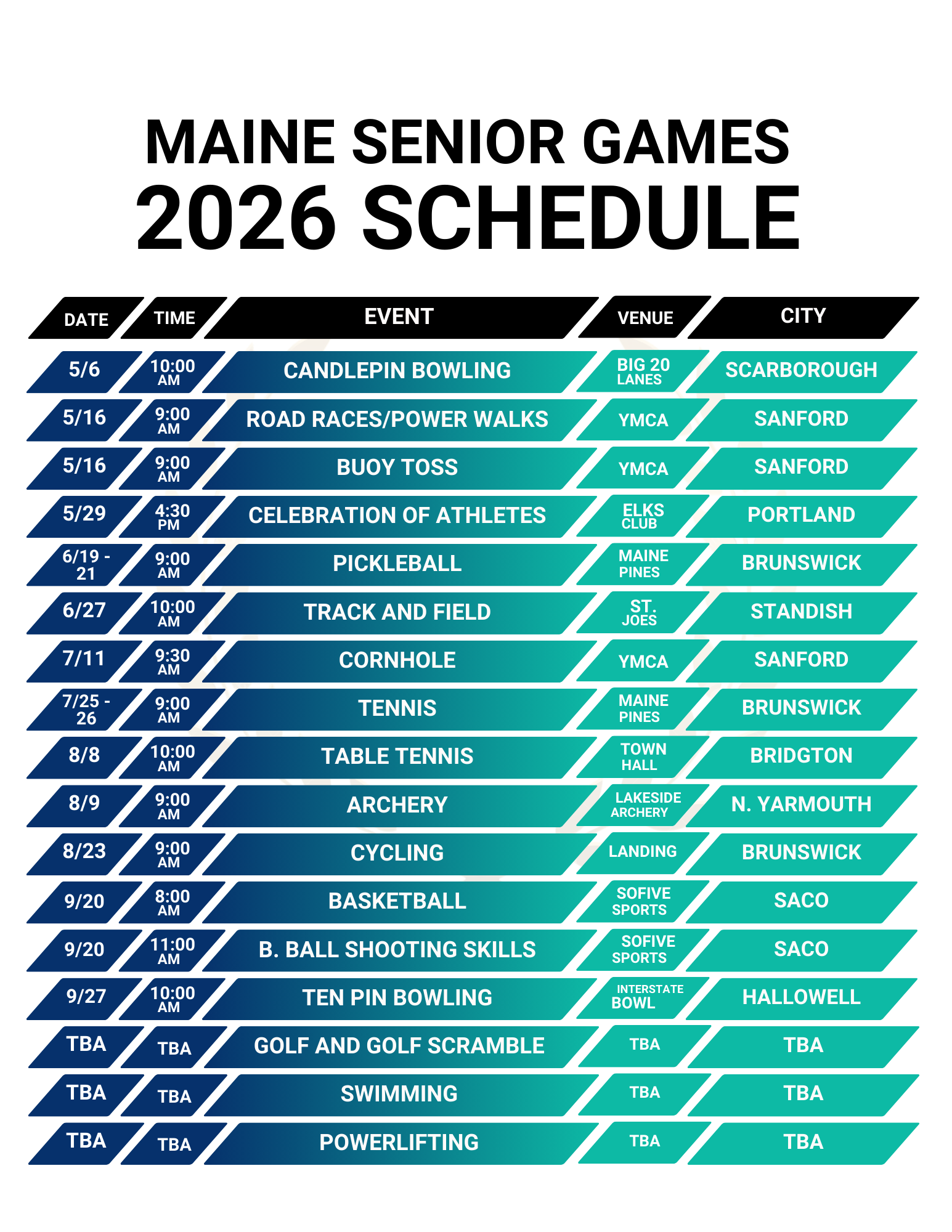 Maine event details are subject to change. Athletes will be notified in the event of a change when reasonably possible.