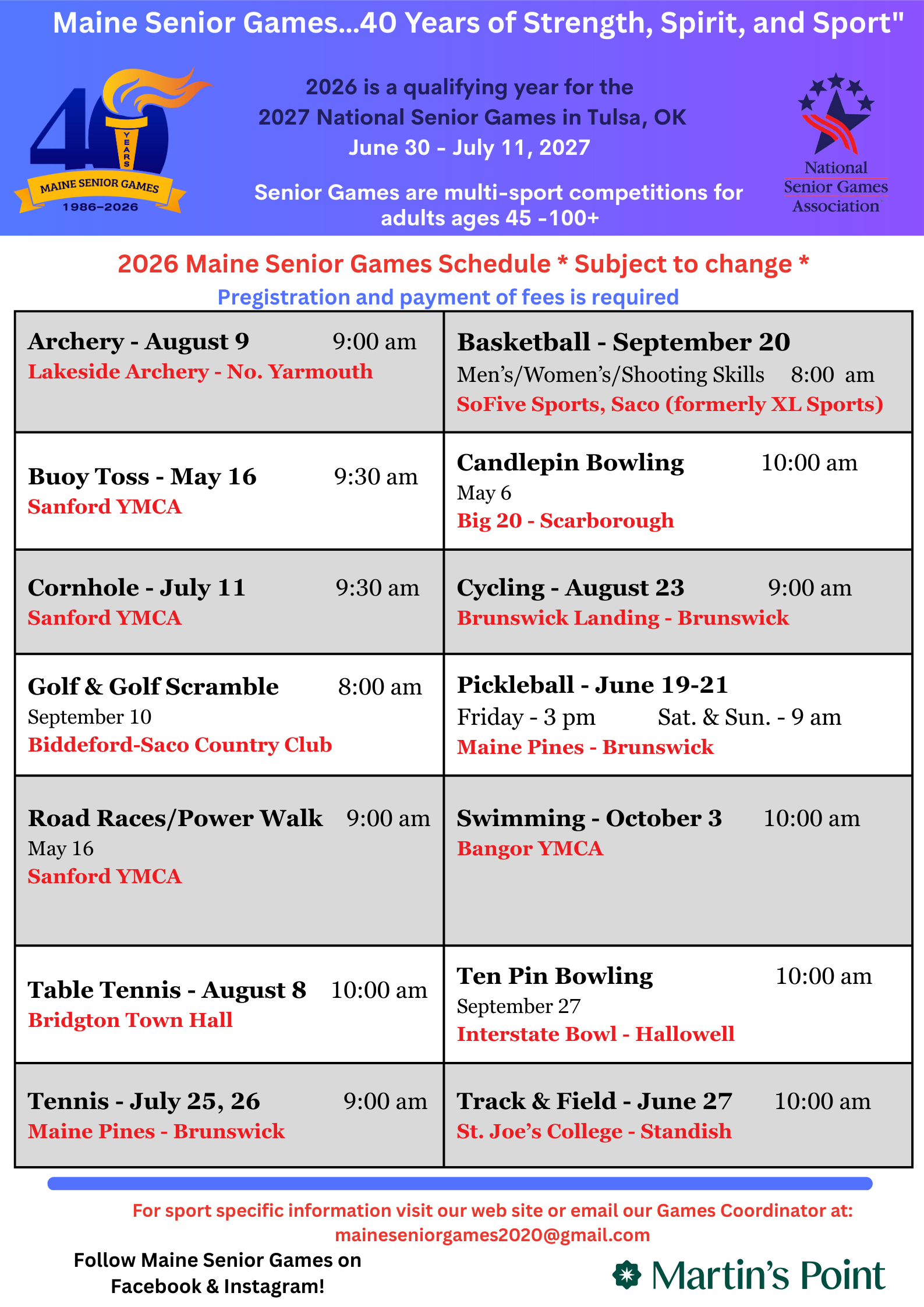 Registration for the 2026 Maine Senior Games begins on April 1, 2026. View all registration options for the Maine Senior Games.